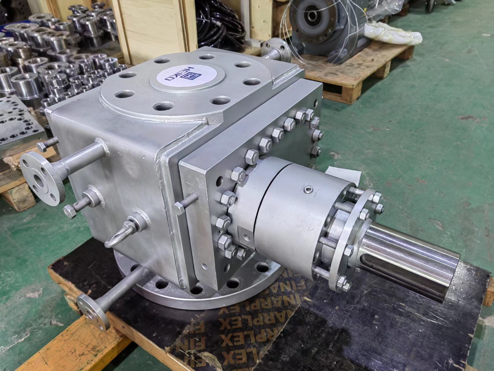 排出過(guò)程:當(dāng)齒輪旋轉(zhuǎn)到另一位置時(shí),齒輪間的容積減小,熔體被擠出泵腔,并通過(guò)出口管道輸送到下游工藝或系統(tǒng)。